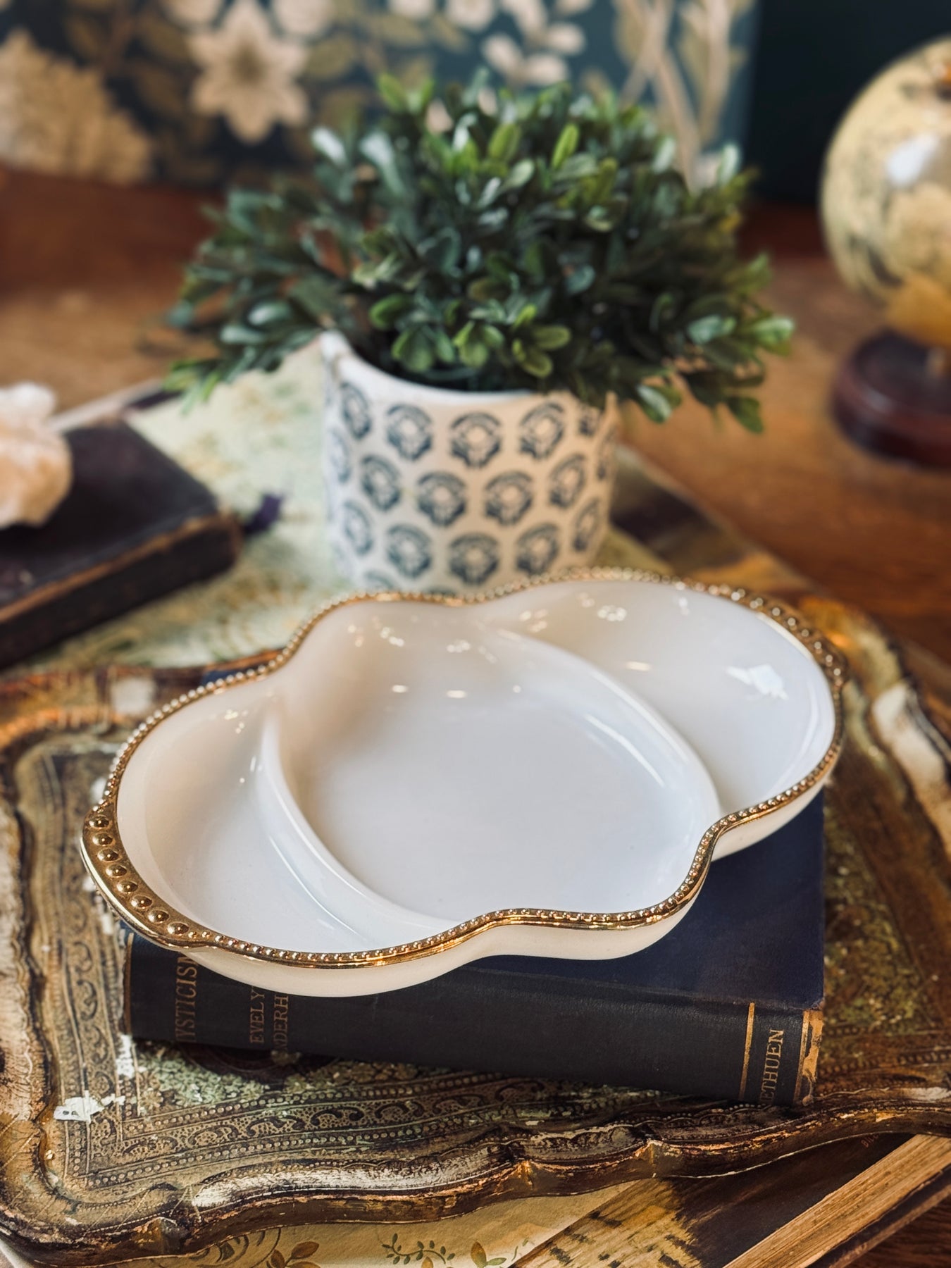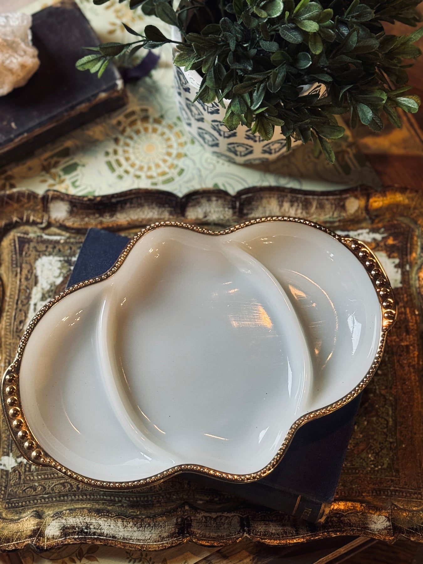 An Anchor Hocking milk glass bowl featuring raised grape and vine detailing with a scalloped, gold-trimmed rim. Elegant and decorative, ideal for display or light serving.
