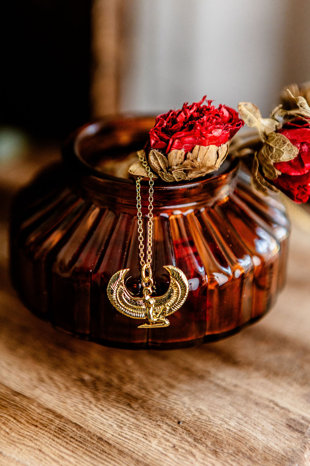Created exclusively for Tamed Wild, this Isis necklace measures approximately 1 inch across and is gold-plated. The chain measures 24 inches.