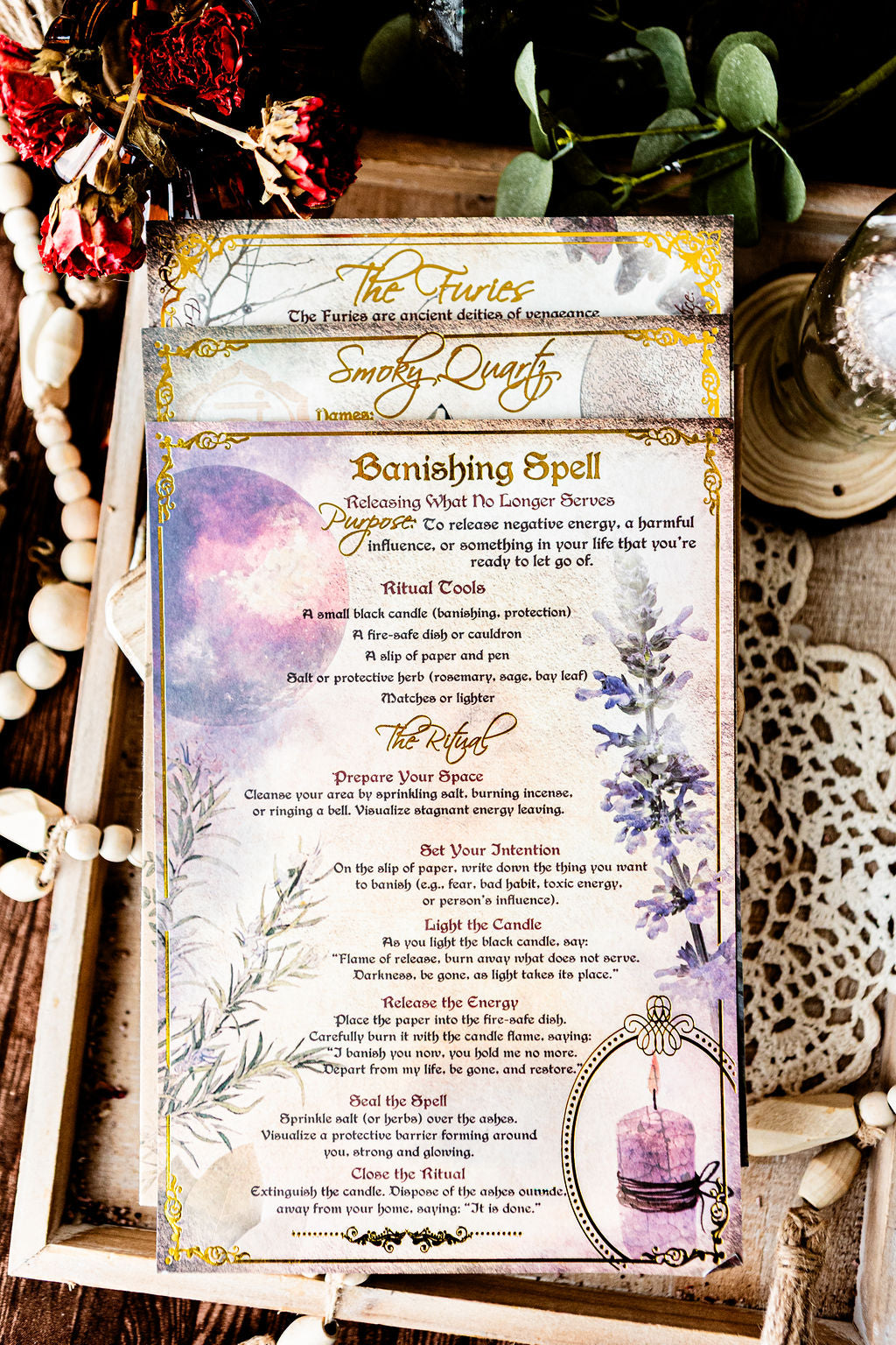 These beautifully designed grimoire sheets were created with your book of spells in mind. Each sheet includes information about a specific topic in earth-based spirituality and is printed on aged parchment with gold foil details. 🌿
