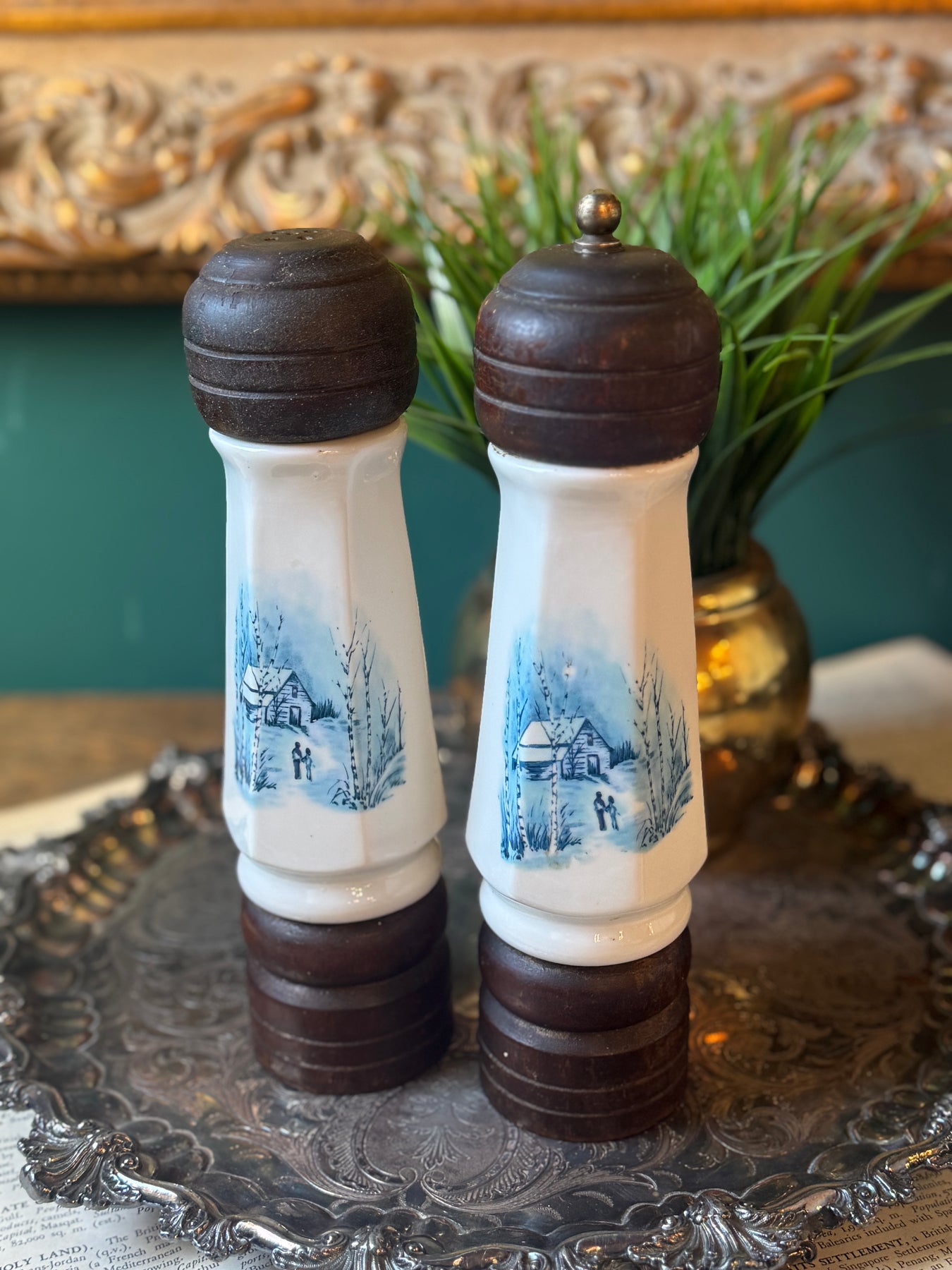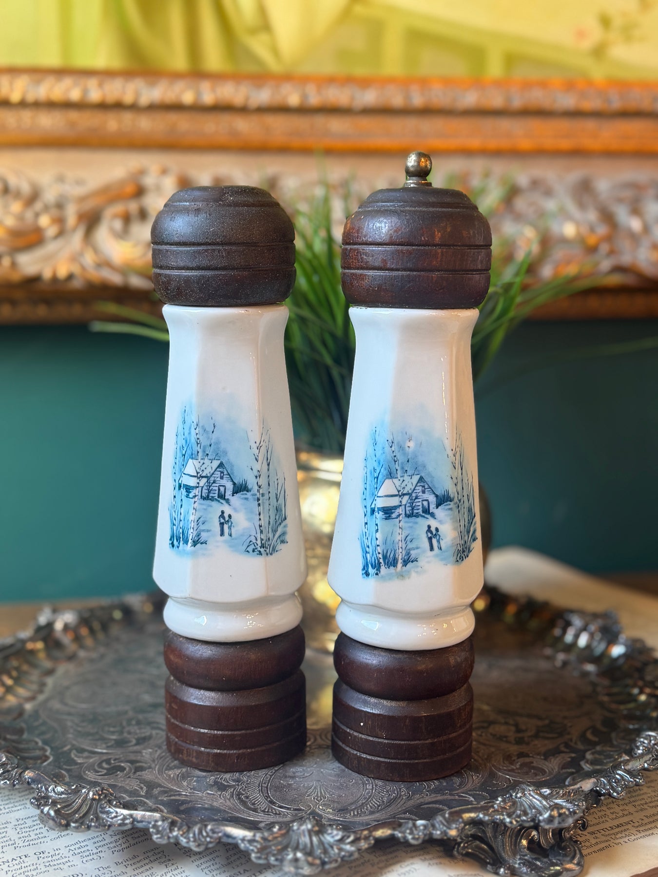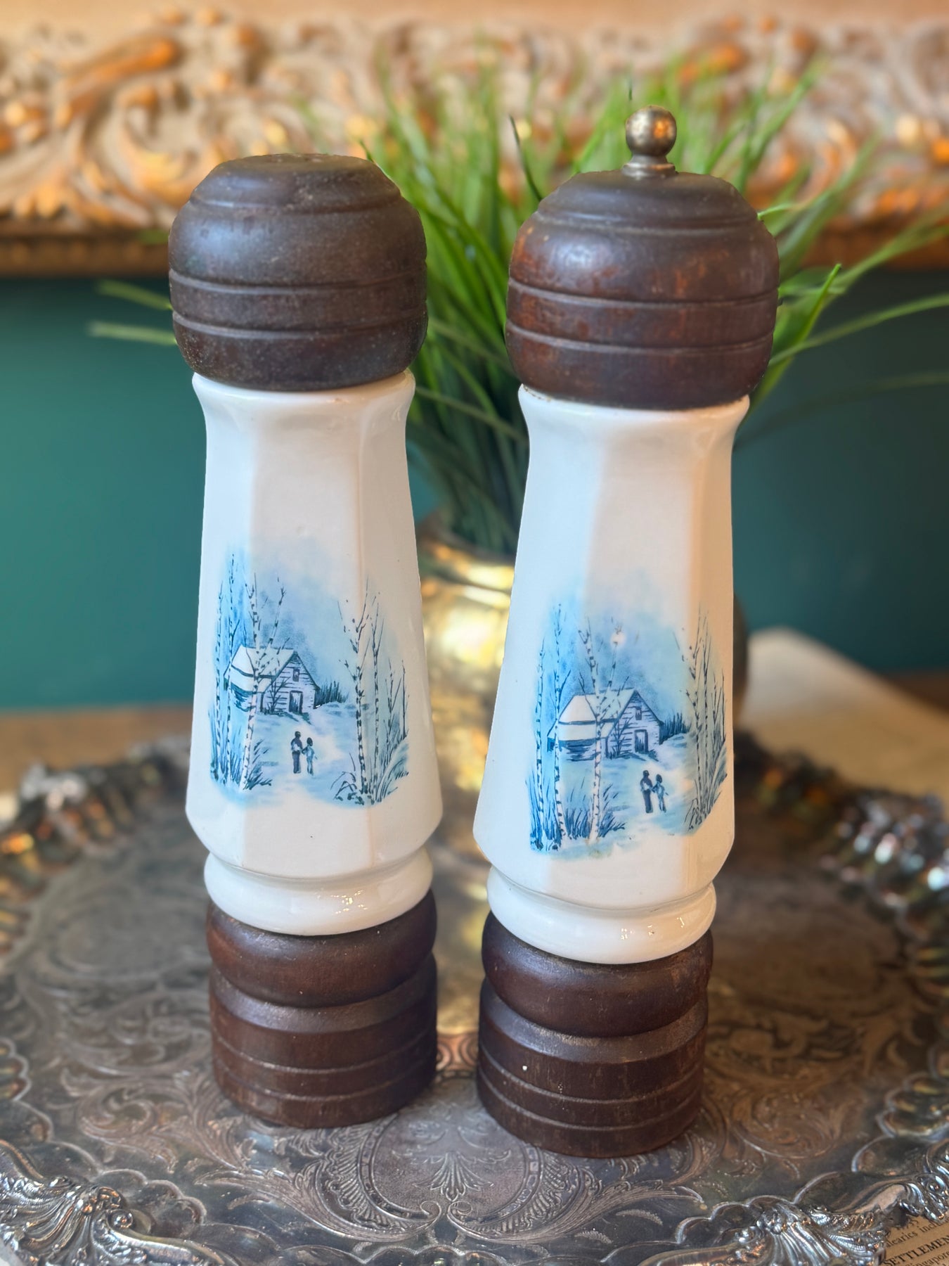 A charming vintage salt-and-pepper set featuring hand-painted winter cottage scenes in soft blue on white ceramic, finished with dark wooden tops and bases. Cozy and nostalgic, they bring a quiet, old-world warmth to the table.