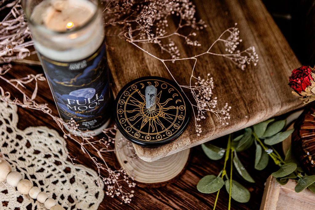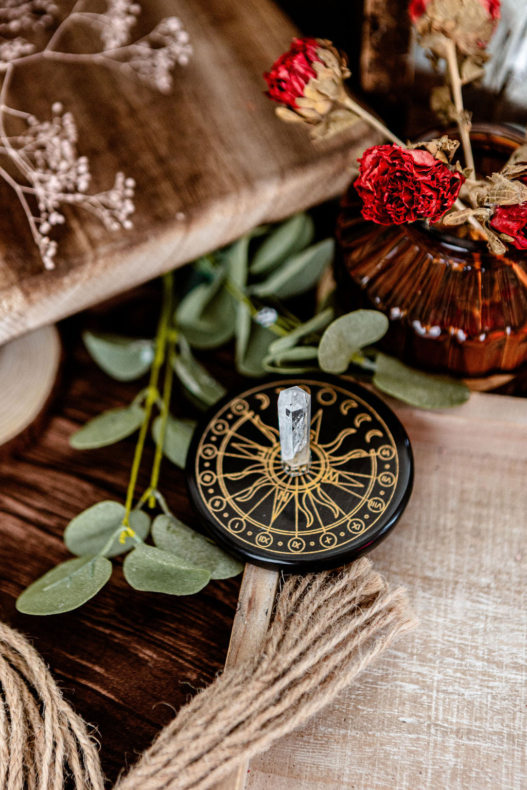 This polished black agate sun clock is centered with a clear quartz generator, perfect for cleansing and charging.
