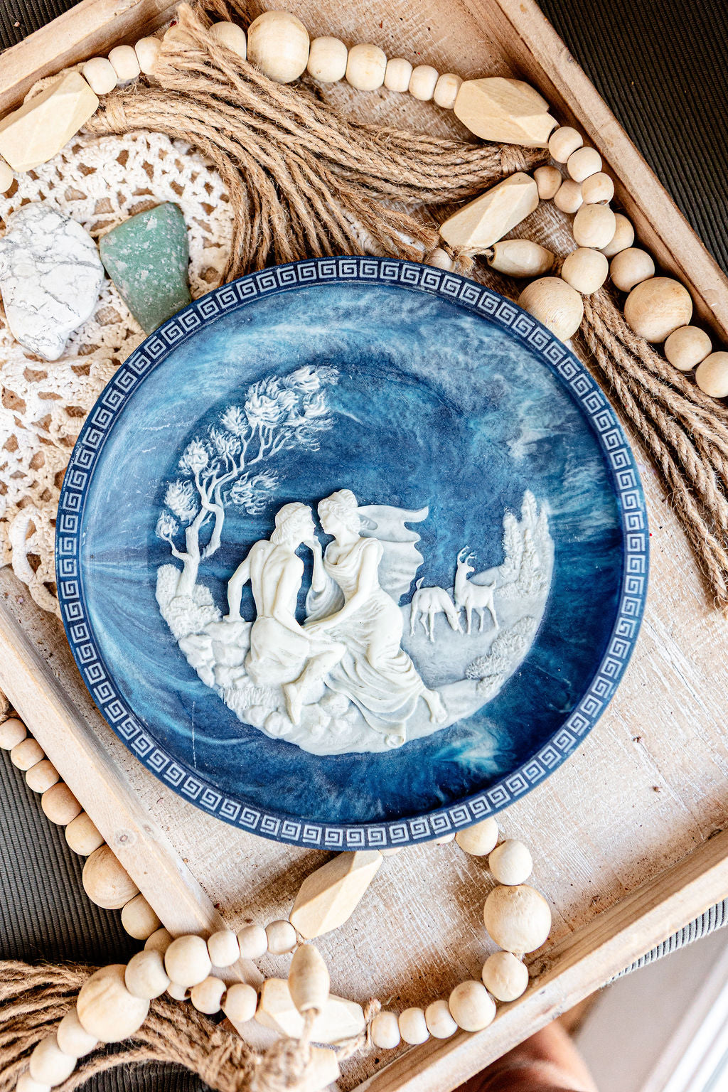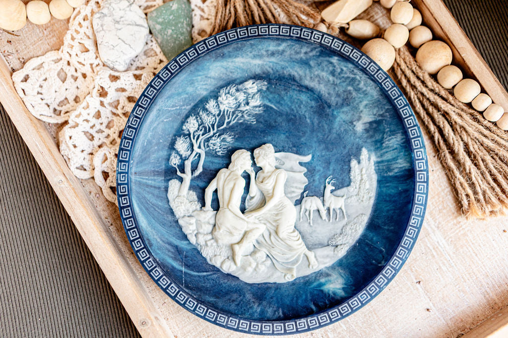 This porcelain plate in ocean blue depicts a scene from Homer’s Odyssey. Ulysses (Odysseus) is shown with Circe, the sorceress who enchanted his men and tested his will, surrounded by windswept trees and deer in the distance. The raised ivory relief is framed by a Greek key border.