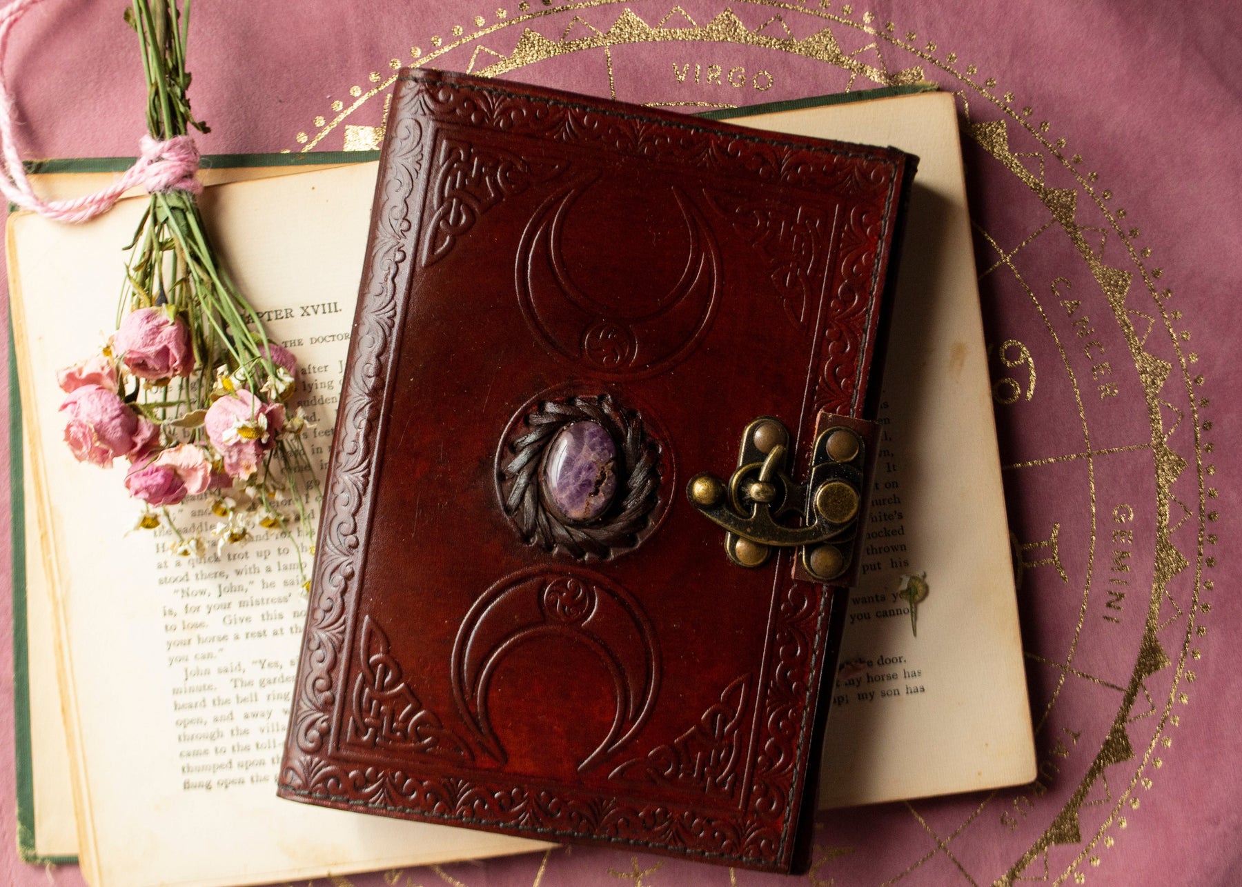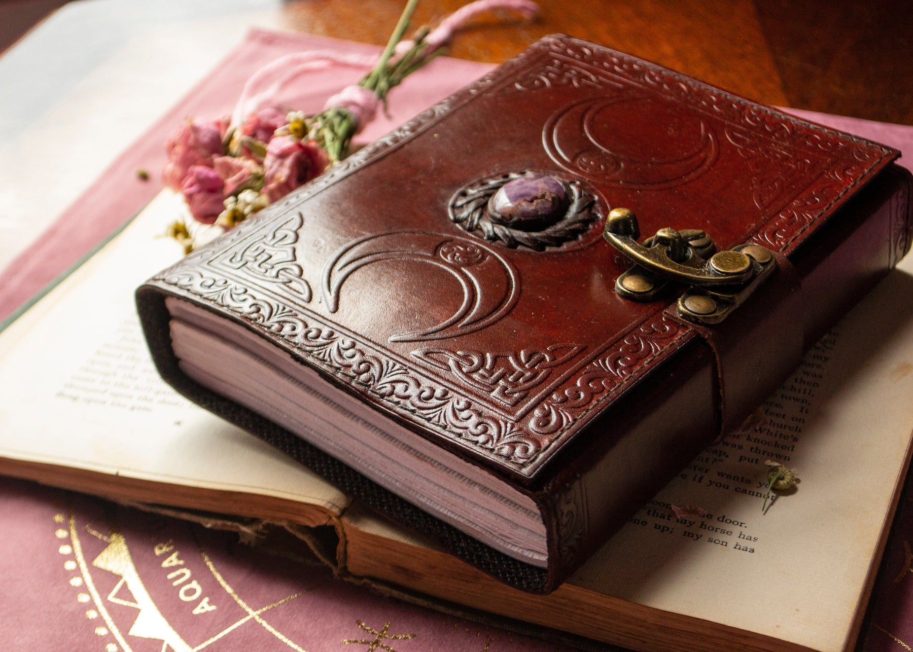 These old-world inspired leather journals contain handmade paper, making it perfect for writing down your intentions, spells, dreams, and thoughts. The cover is engraved with the triple moon symbol, representing the Goddess; the maiden, mother and crone.