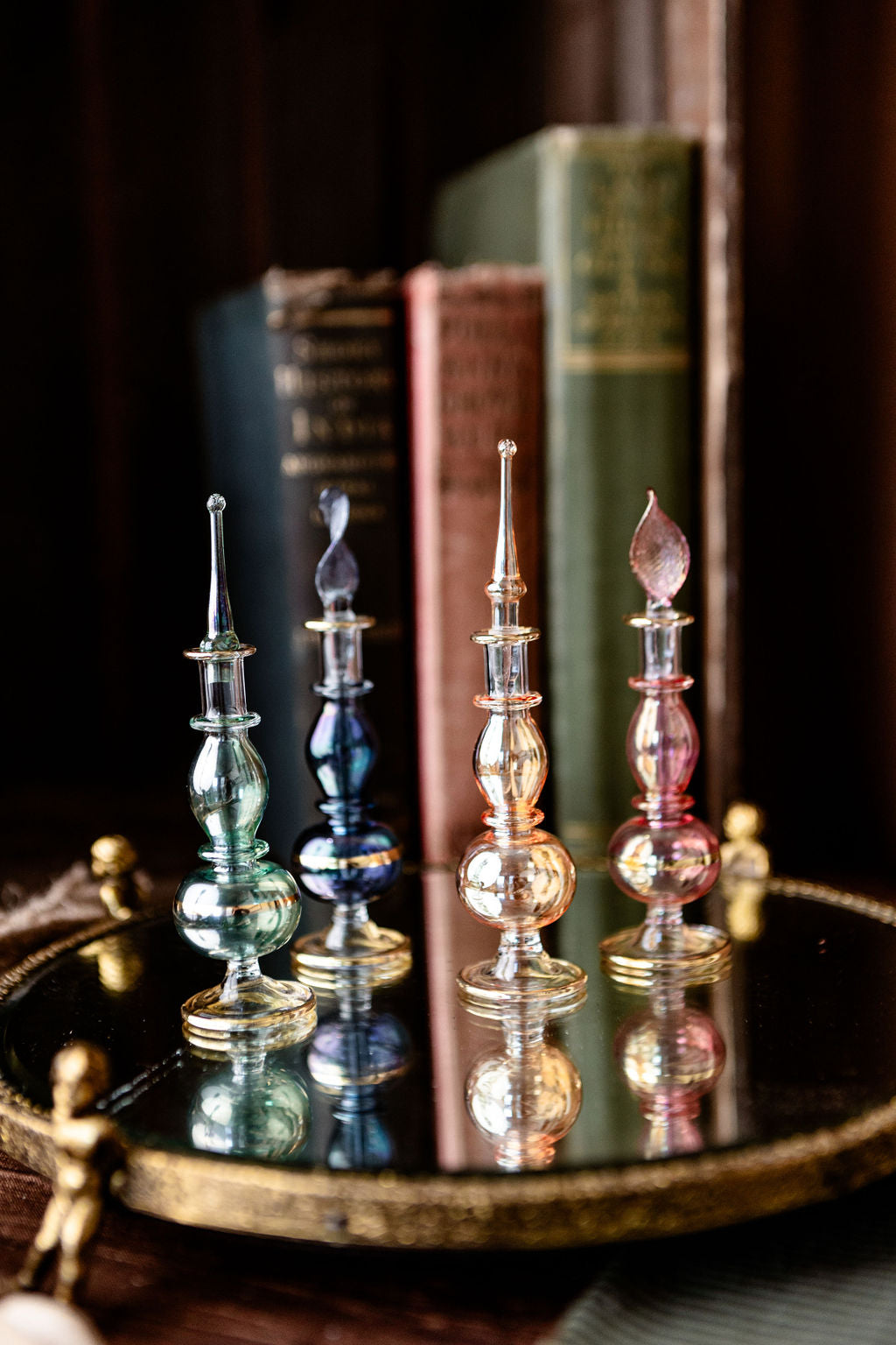 These dainty little perfume bottles are made in the traditional Egyptian style and were inspired by our recent trip to Cairo. Each bottle measures approx. 5 inches tall and stock is limited.