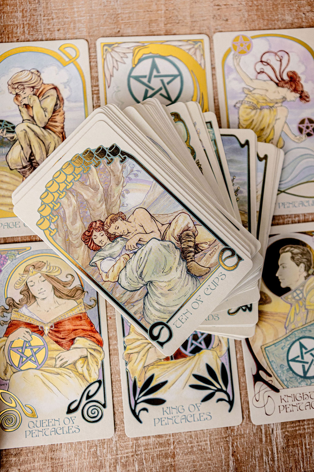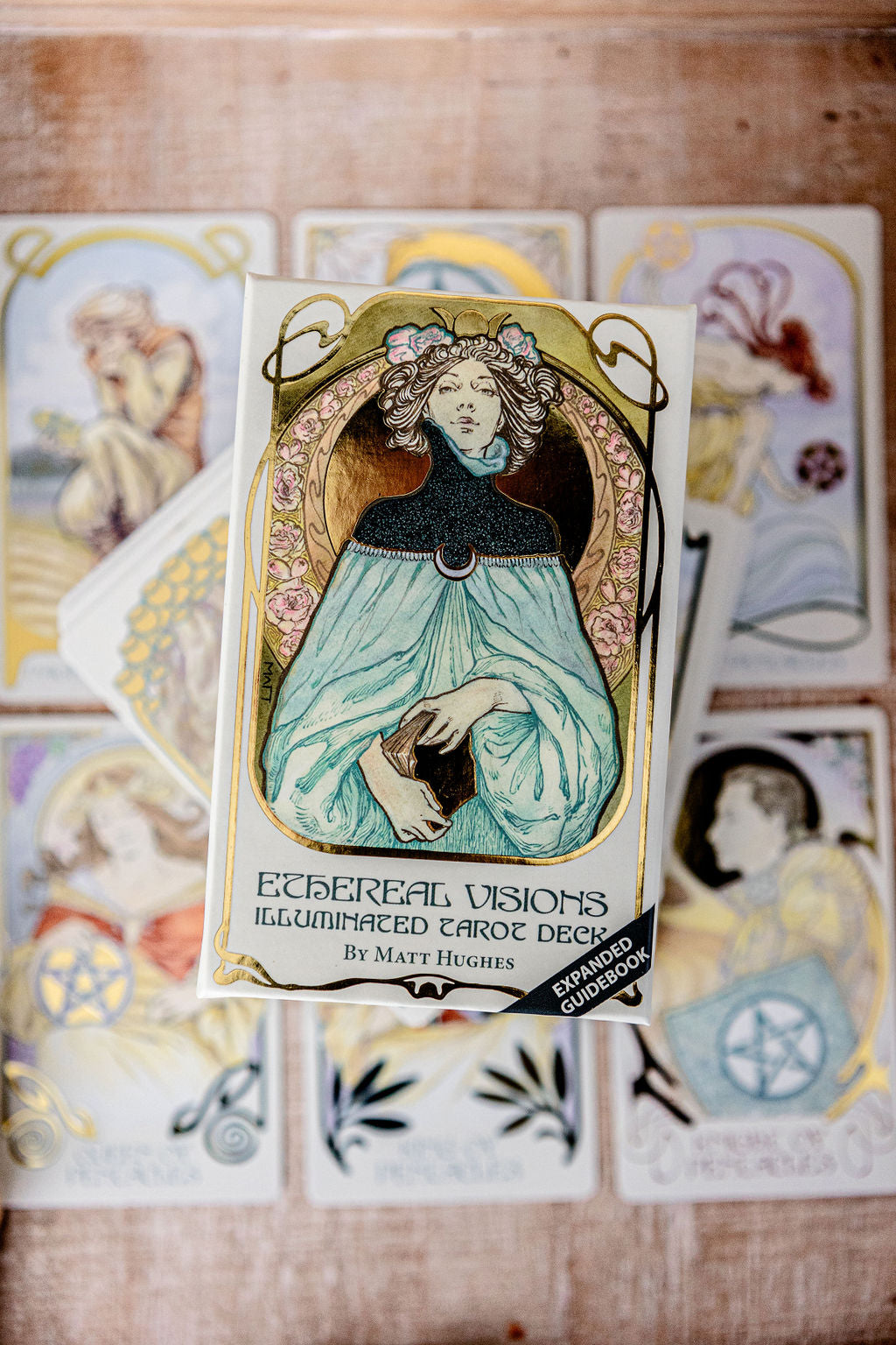 In creating Ethereal Visions Tarot Matt Hughes has drawn inspiration from the Art Nouveau movement, adopting its distinctive style and meticulous approach to craftsmanship. Every detailed image in the 78-card deck is hand drawn and colored. Each card is illuminated with gold foil stamping, to elegant effect. Includes a 48-page booklet. Matt Hughes is a self-taught artist who focuses on the aesthetic approaches referred to today as "The Golden Age of Illustration". His style combines inspiration from the Art Nouveau, Pre-Raphaelite and Symbolist movements, to produce an artistic expression uniquely his own.