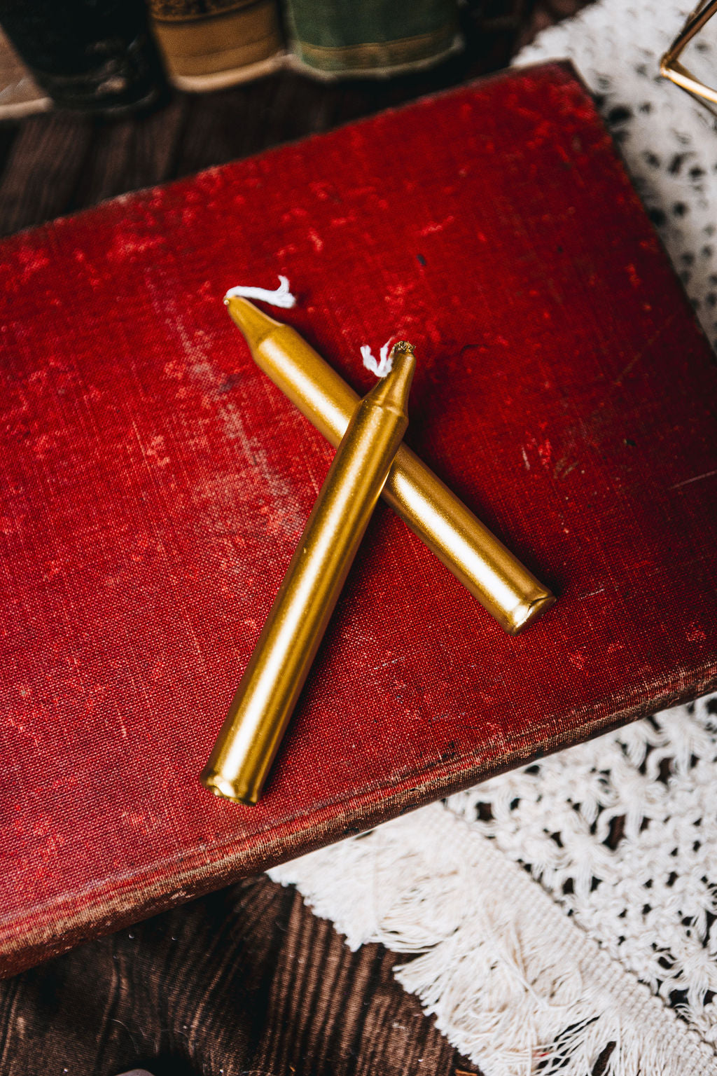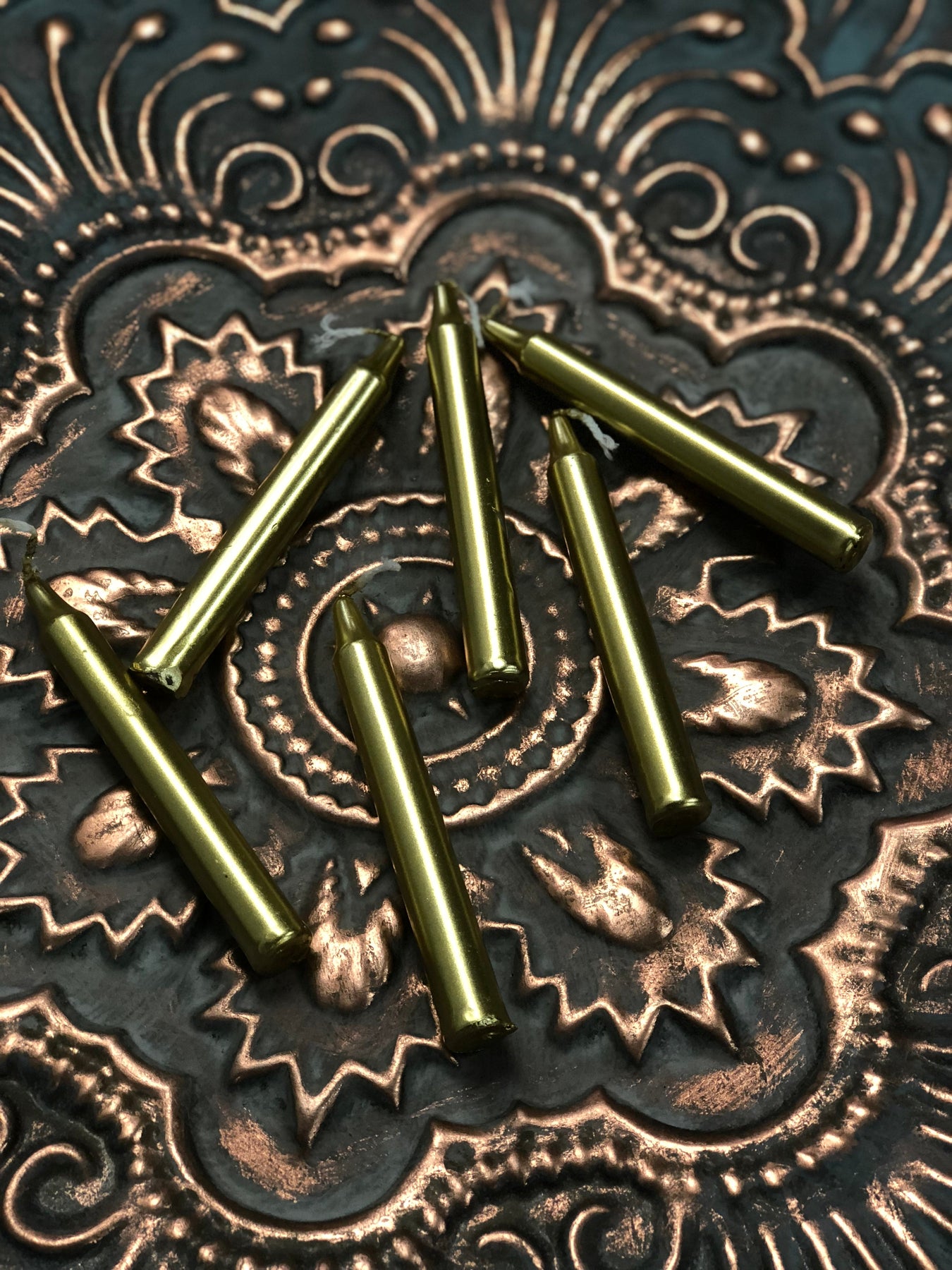 Six gold chime candles laid out on a table.