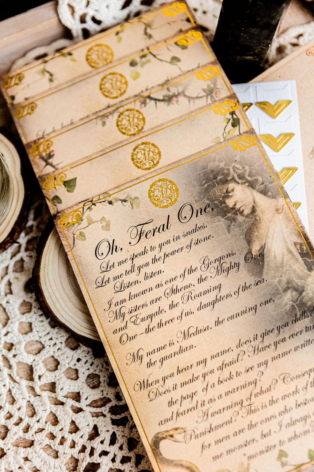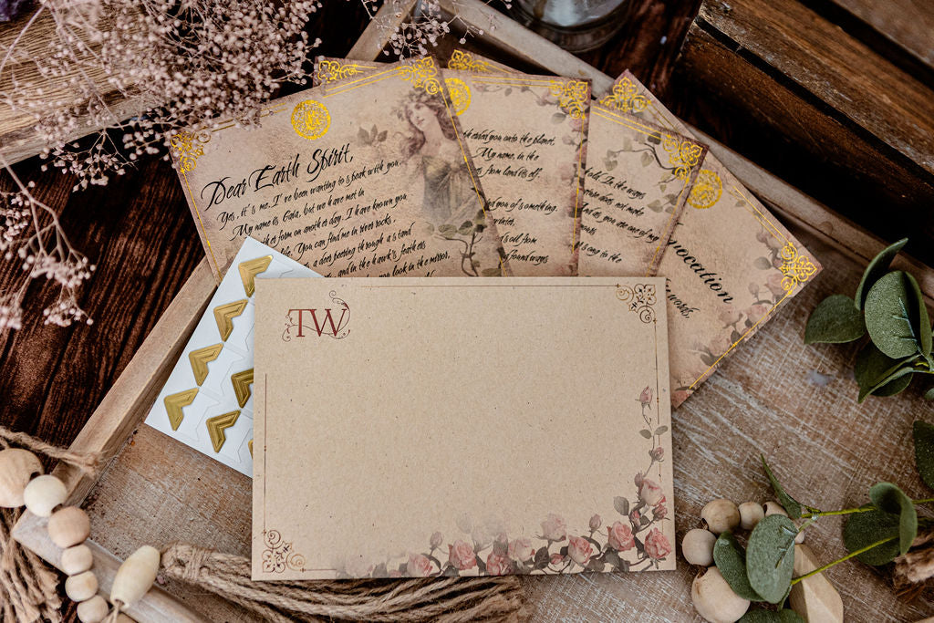 Muse Mail is a channeled message offering, delivered to you from us. These messages are channeled by Kate Belew and include a four-page letter, an invocation card, and gold corners for saving in your grimoire or book of shadows.