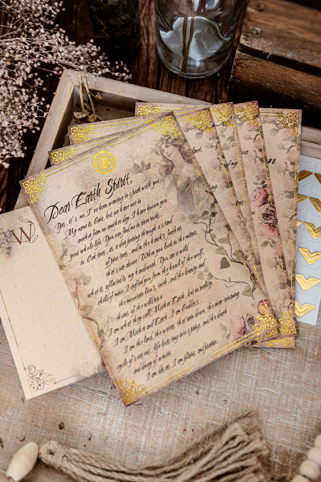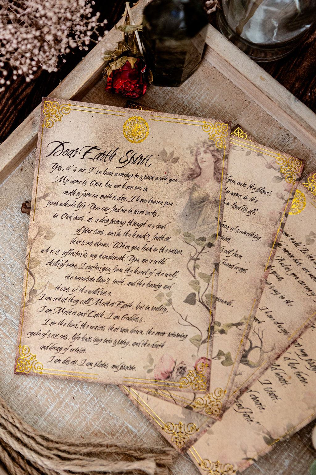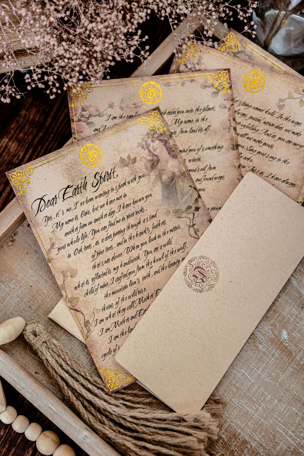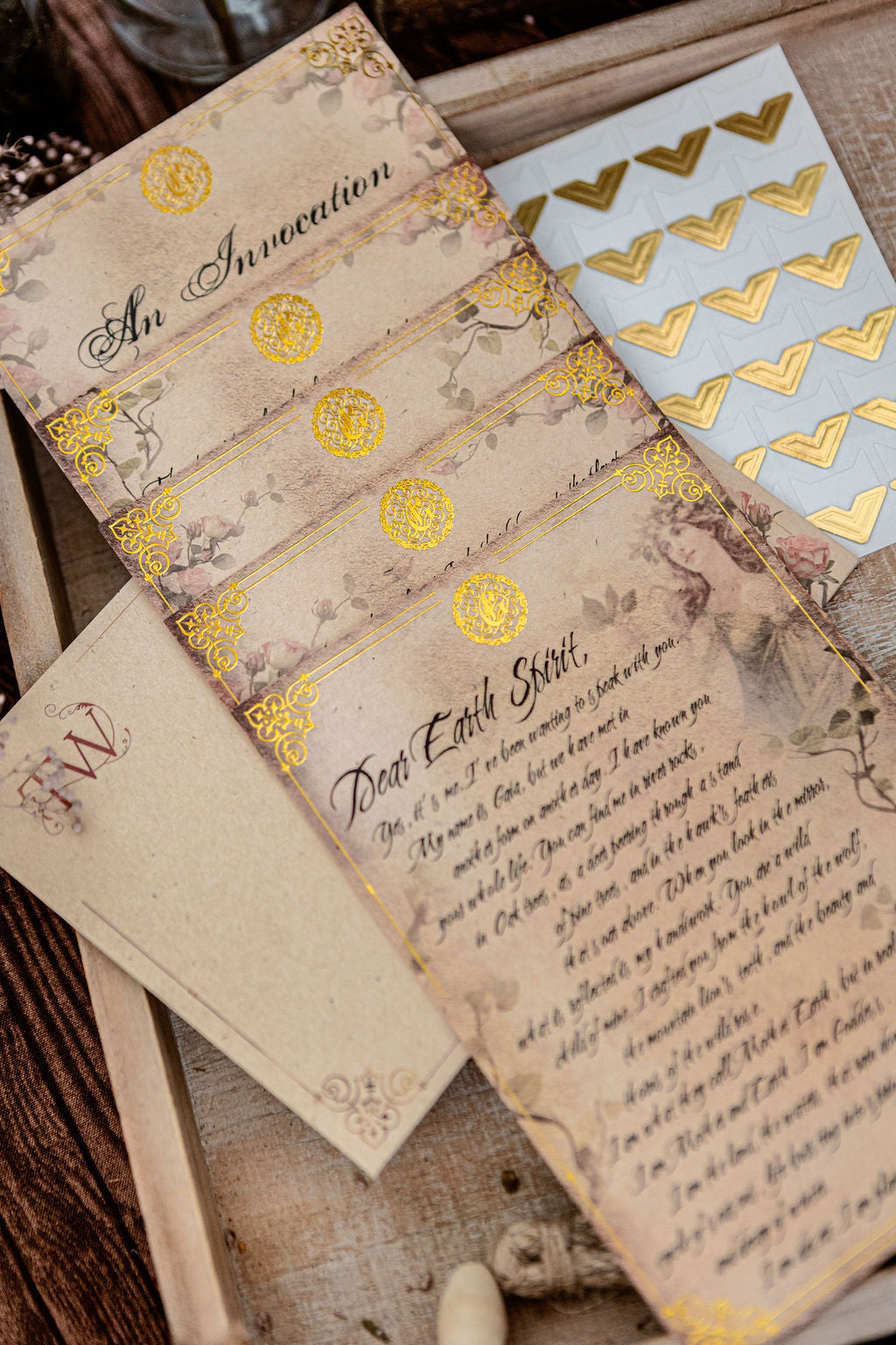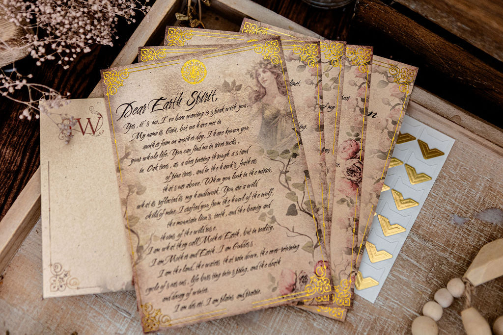 Each set is 5 x 7 inches. The invocation card is printed on a thicker paper than the four letter pages, making it a beautiful option for framing or placing on your altar.