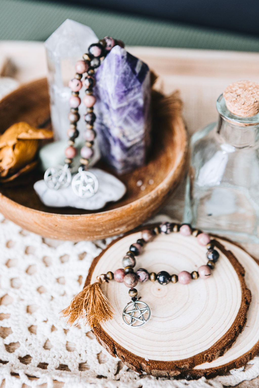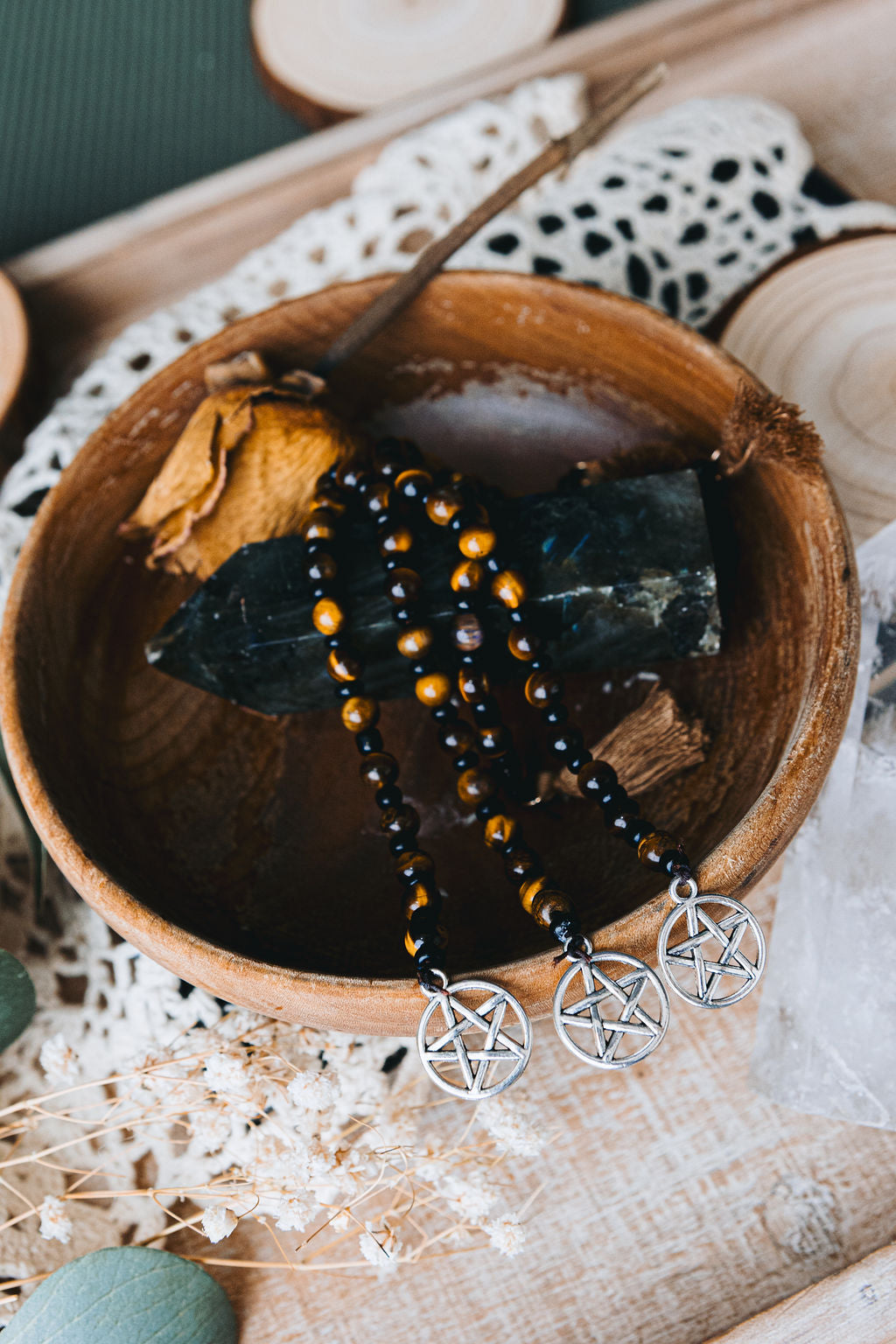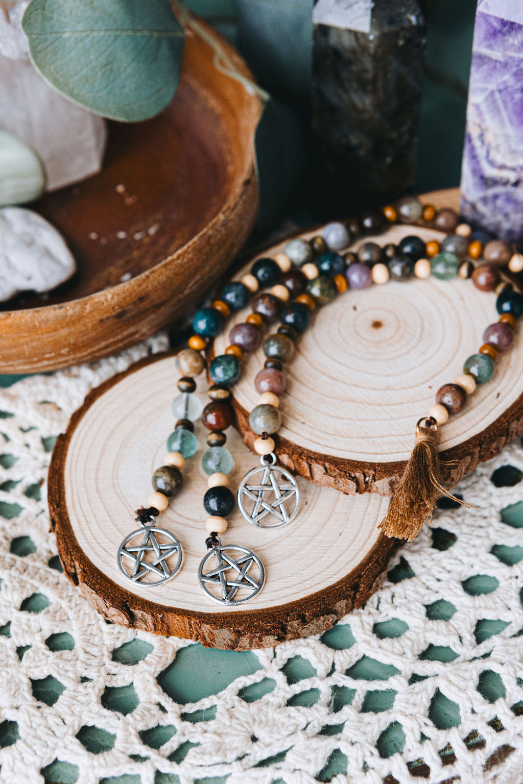 In many different cultures, prayer (or intention) beads are used to help ground and focus your energy when working in your practice. Use these beads to count your prayers, release your worries, or keep them in your hand as a reminder to stay focused. Repeat your intention, running your fingers over each bead, once per bead. This can be done vocally or mentally.