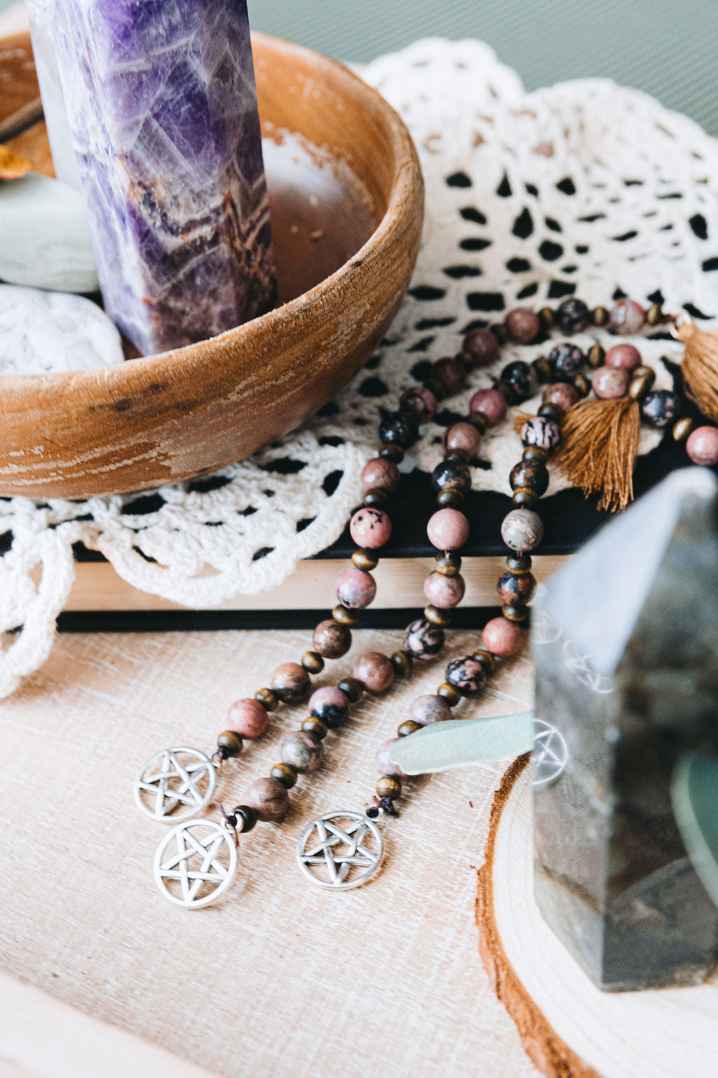 These Prayer Beads were made by hand by Tamed Wild Creatrix, Shelby, and her daughter, Saylor. They consist of real stones and glass or wooden spacer beads, depending on the design.