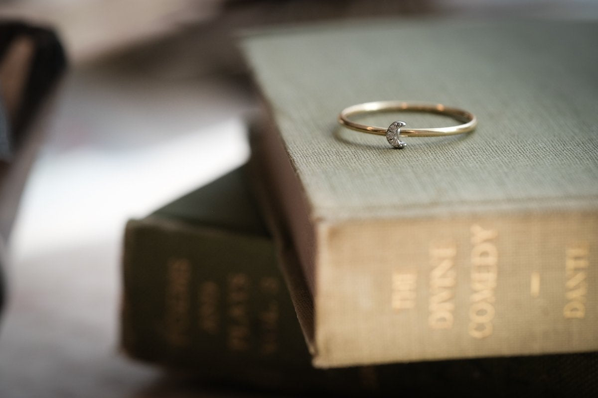 This 14k gold ring has the daintiest of crescent moons made of pave diamonds. Its delicate size makes it the perfect stacking or midi ring.