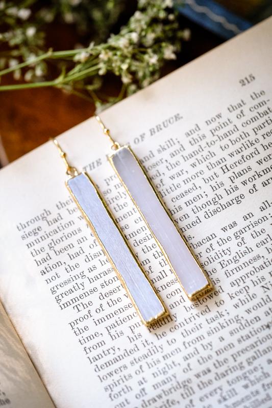 Selene is the goddess of the moon. She rides across the sky in her chariot wearing the moon and a cloak. She has the power to light up the night and is in charge of the days passing. She is ever changing and evolving, much like the moon herself. Love yourself through each and every phase. Work with the energy of Selene by wearing our Selene Earrings. 2" raw selenite sticks wrapped in electroplated gold.