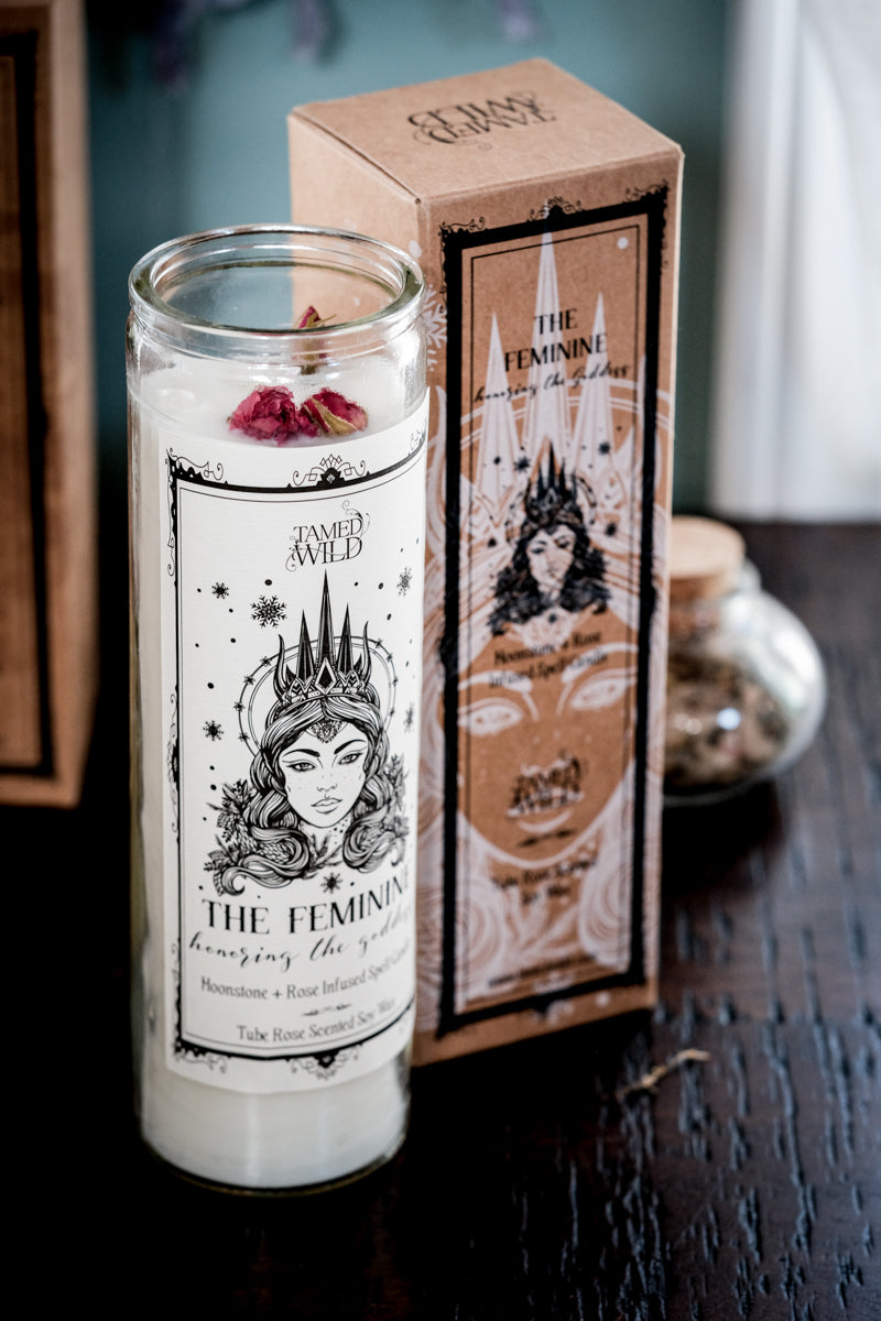 The Feminine – Moonstone is sacred to the Goddess and represents the power she bestows upon us through the lunar cycles. Rose is the most revered flower and herb of the feminine, representing divine beauty and grace throughout time. Geranium Oil completes the three elements and seals this candle for use.