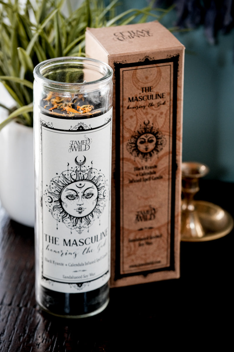 The Masculine – Black Kyanite represents the masculine in all of us and serves as a direct connection to the Divine Masculine. Calendula is sacred to many cultures and is used in ritual to honor the sun and the Gods that rule it. Cedarwood Oil completes the three elements and seals this candle for use.
