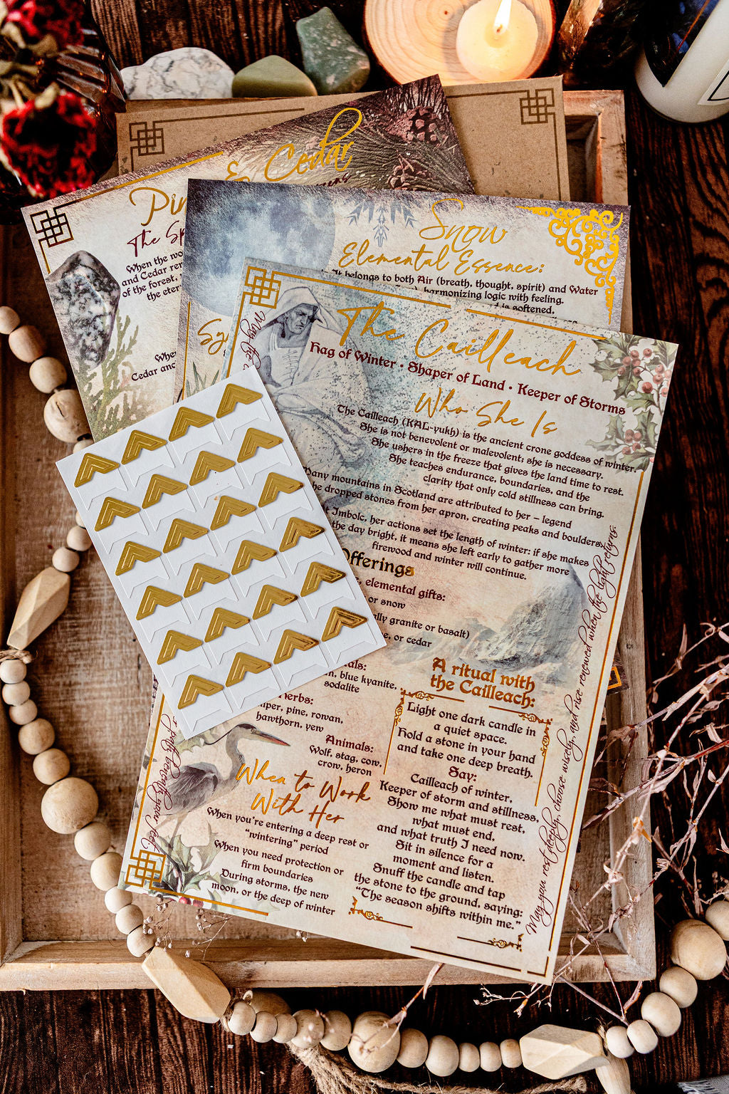 Each kit includes the grimoire sheets and gold corner stickers. (The sheets are 7 x 10 inches so that they can fit into any standard 8 x 10 grimoire or notebook. Our faux leather grimoire is available now , click here .)