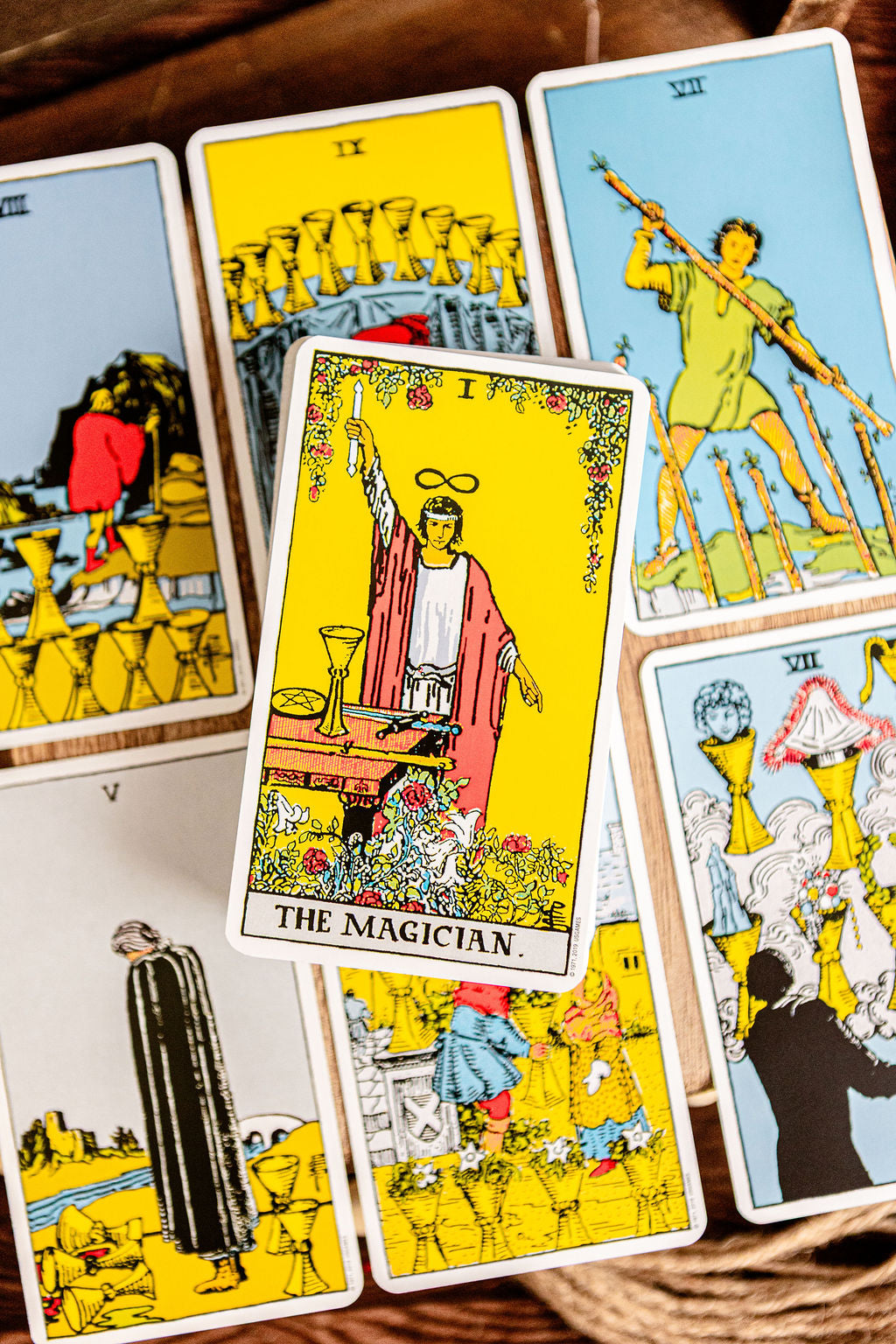 The cards were drawn in 1909 by Pamela Colman Smith under the direction of Arthur Edward Waite. Smith's vibrant drawings transformed the standard tarot deck.