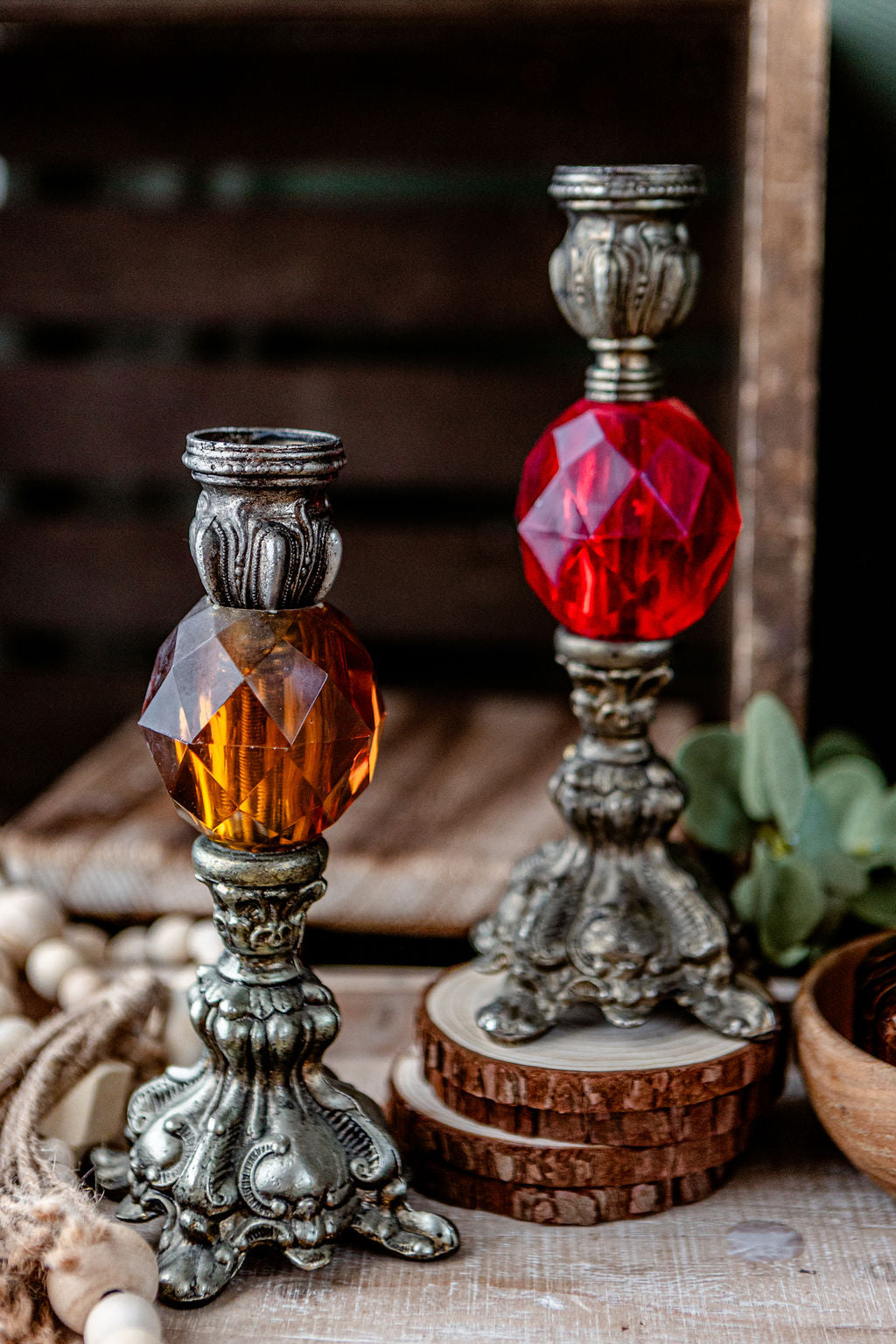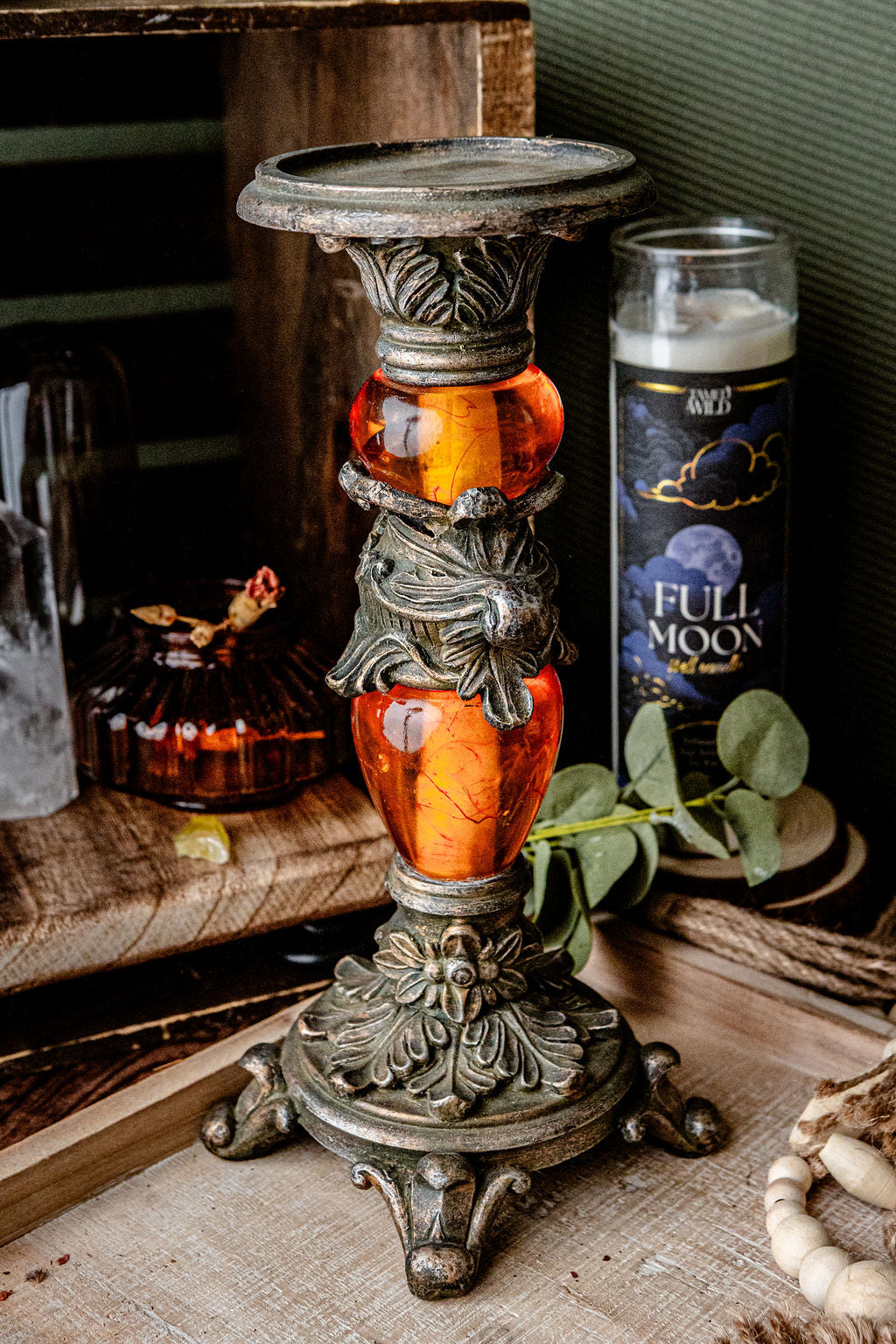 Measures 9.5 inches, made of brass with amber resin or hard plastic.
