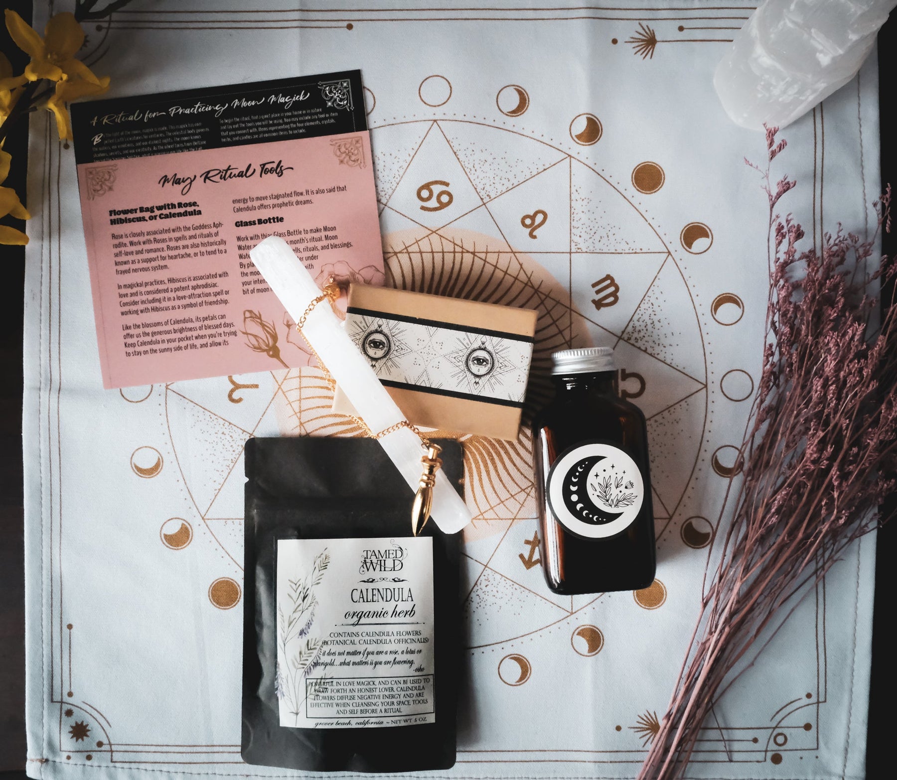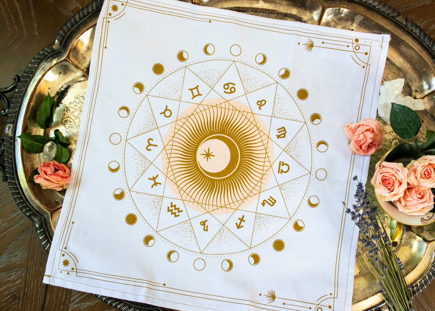Bring the magic of the moon and astrological signs into your altar building and practice. This soft pink and rose gold design is a magickal addition to any sacred space. What do each of the phases of the moon teach you? How do you connect to each of the signs of the zodiac? Work with this altar cloth as your guide.